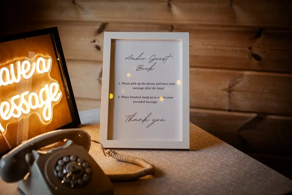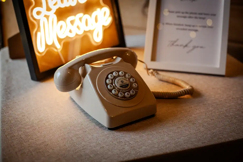 The vintage-style telephone is beautifully styled within your event space and ready for guests to use throughout the day or evening. Simply lift the handset, listen to your personalised greeting, and leave a message after the tone. From emotional well wishes to hilarious late-night dance floor moments, every message is safely recorded and preserved.