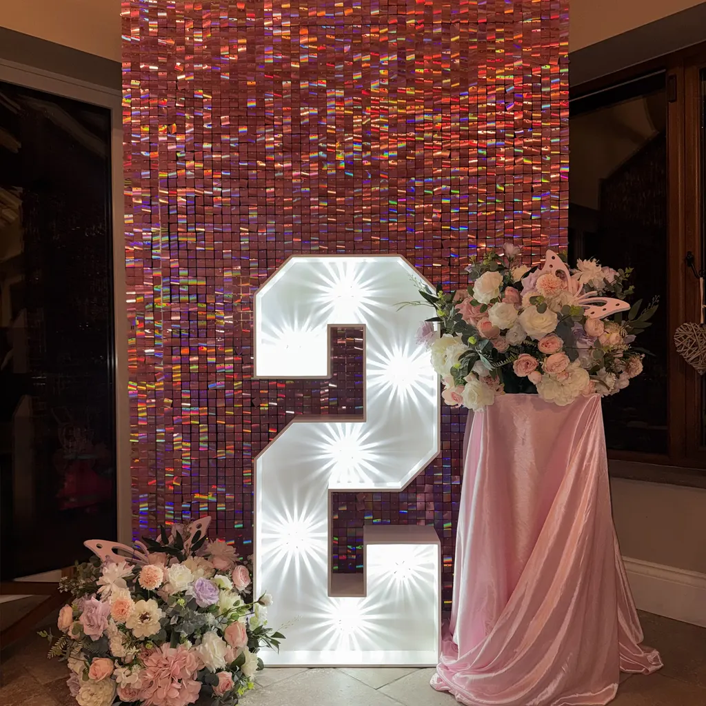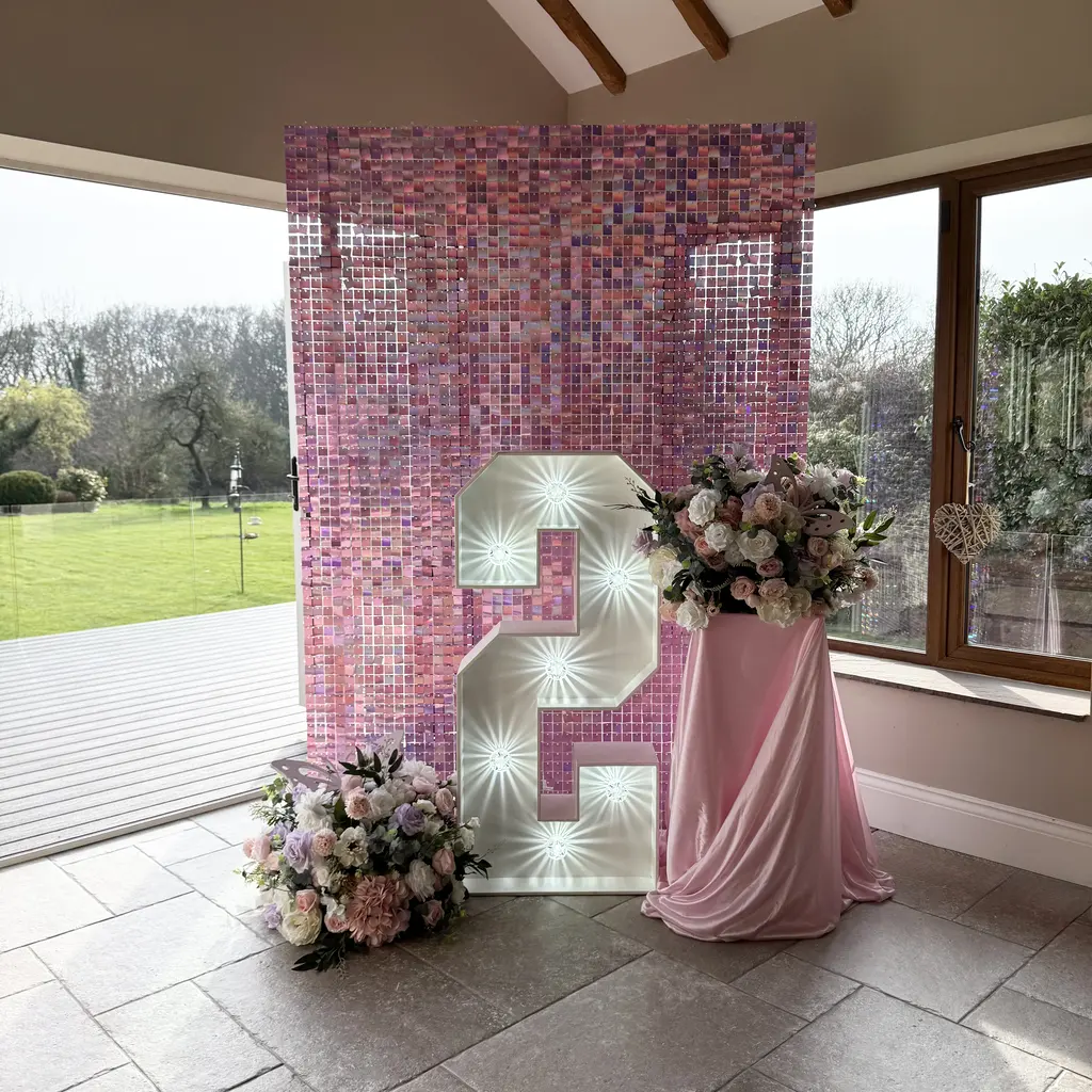 Featuring our petite sequin wall in iridescent unicorn pink, this backdrop catches the light effortlessly and adds that subtle sparkle every celebration needs. It is complemented by two pastel floral and foliage arrangements, styled to frame the setup and add a natural, luxe finish. The light-up number 2 stands proudly as the centrepiece, paired with a plinth dressed in a soft pink silk drape to complete the look.