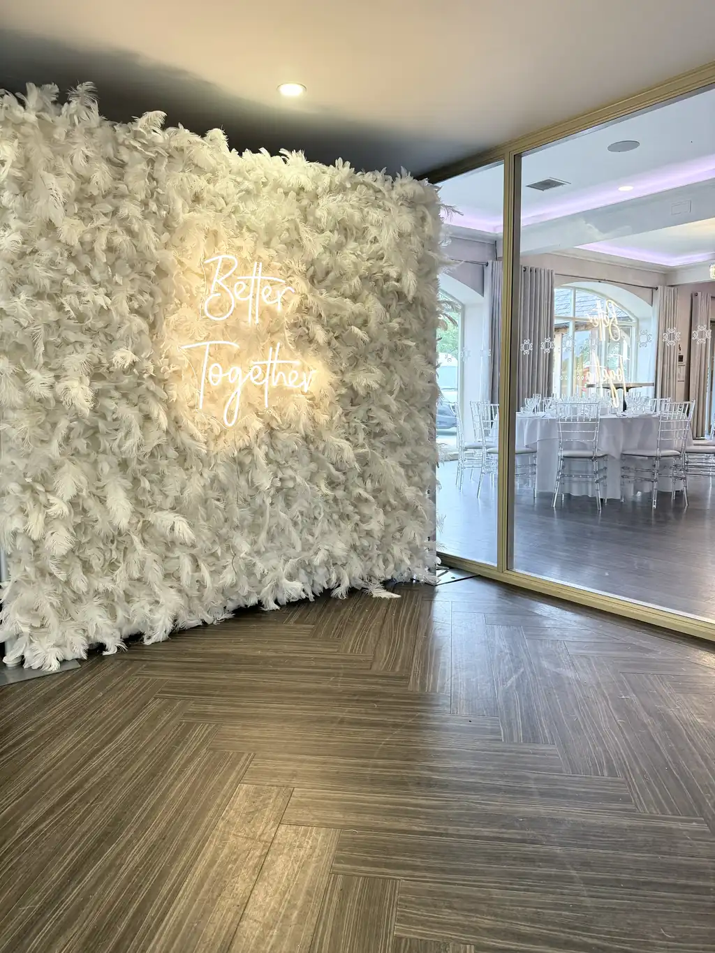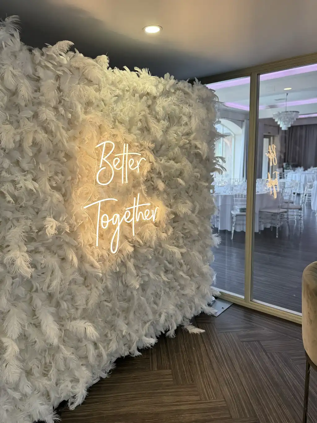 Paired with your choice of neon sign, the feather wall offers a beautiful contrast between softness and glow, making it ideal for statement photo moments and styled backdrops. Whether used as a ceremony feature or a reception highlight, it delivers a polished look that photographs effortlessly.