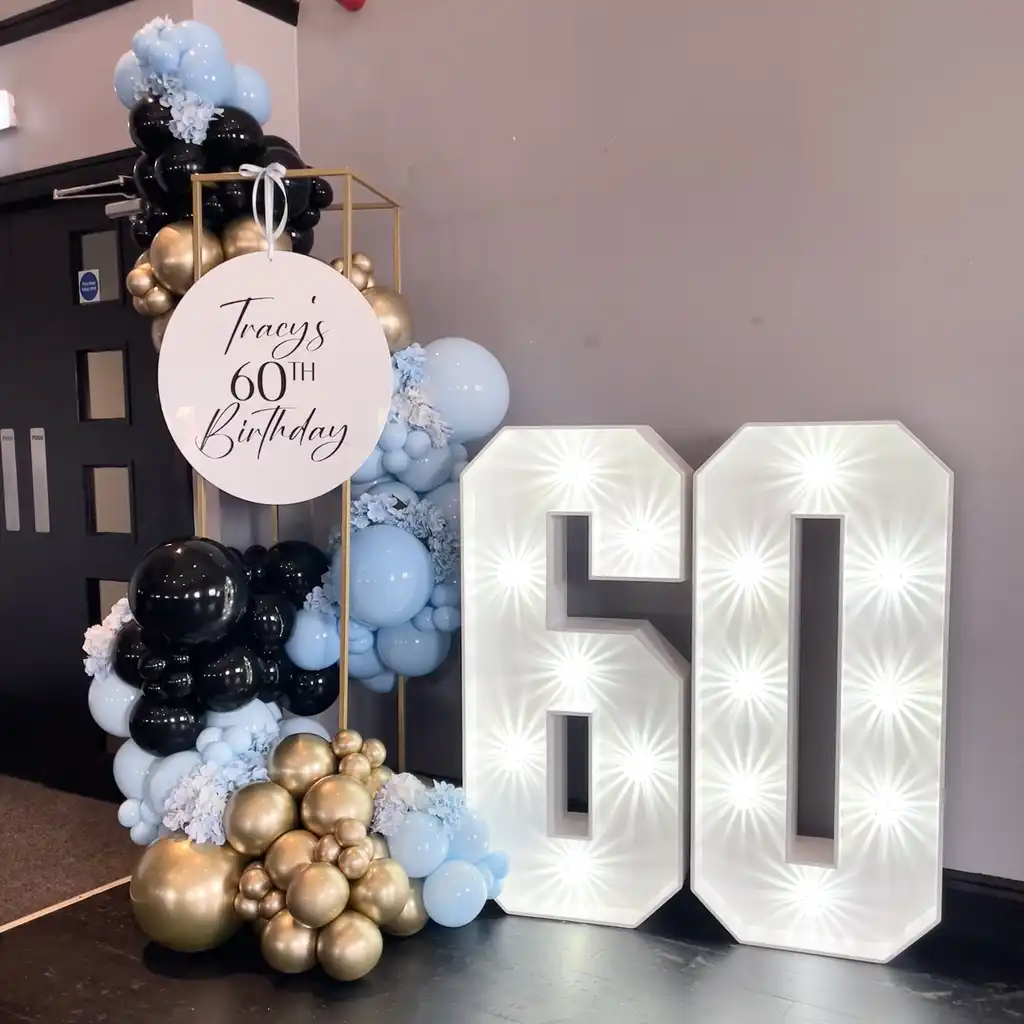 The Luxe Plinth Package offers a refined and contemporary way to style milestone celebrations. Designed around a cascading balloon plinth and illuminated numbers, this set-up creates an elegant statement without overpowering the space.