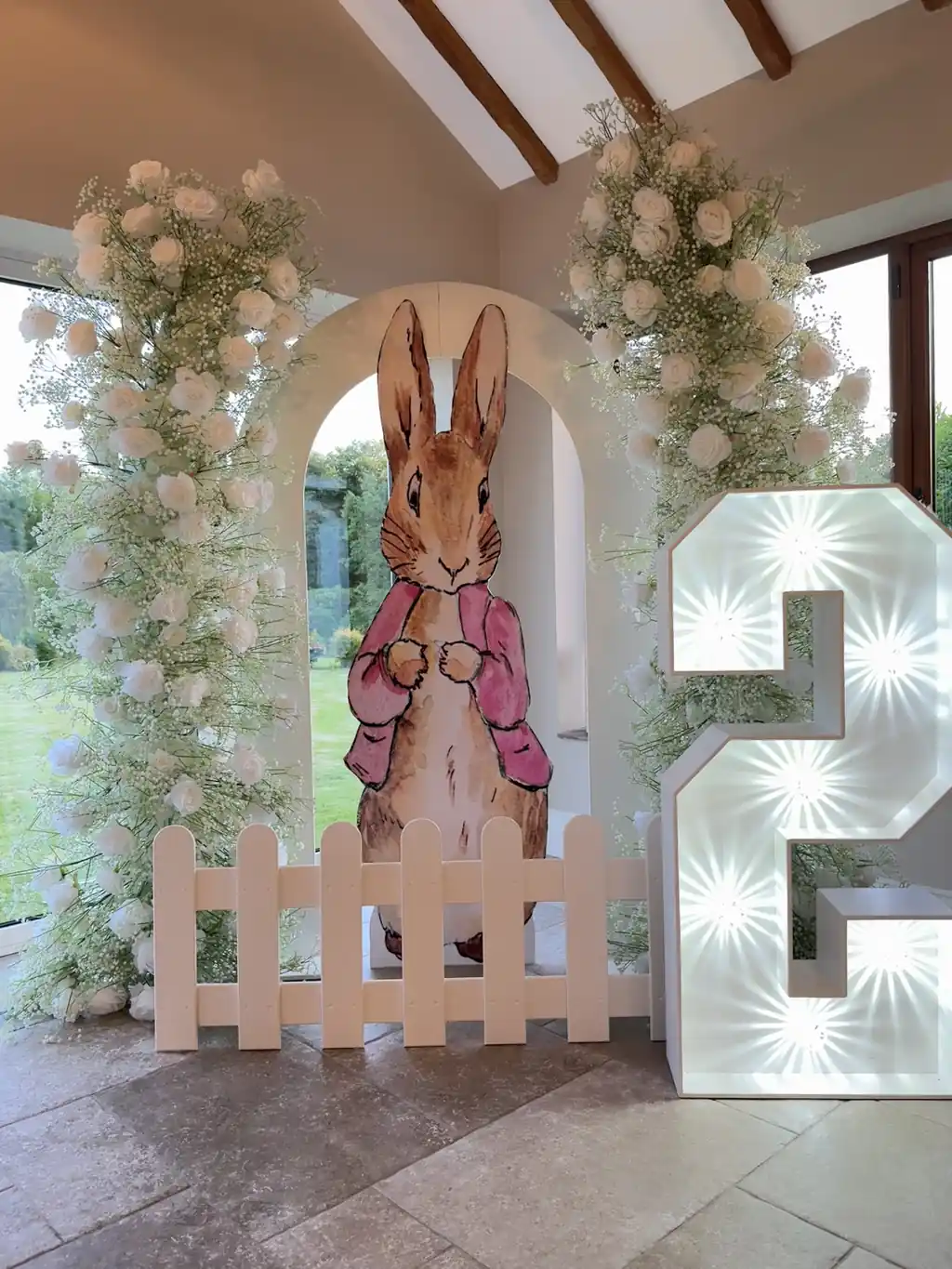The display features a hollow sailboard backdrop styled with delicate gypsophila and white roses, complemented by a character prop and white picket fencing to complete the look. A light up number adds a statement finish, making it perfect for photo moments and elegant garden-inspired themes.